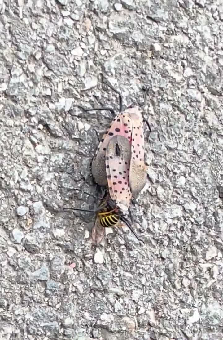 A wasp consuming two joined lanternflies