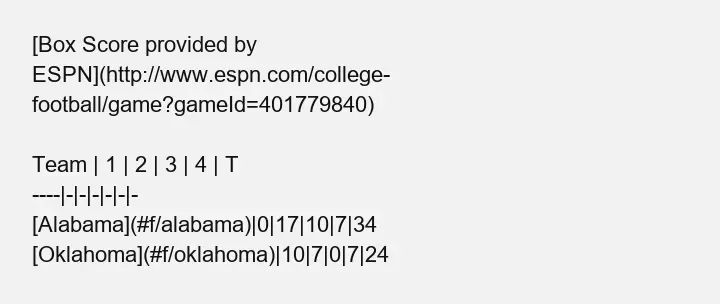 The Alabama Crimson Tide pulled off a noteworthy victory against the Oklahoma Sooners, taking the game 34