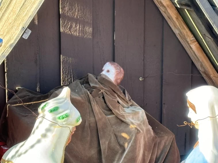 In the quaint town of Willow Creek, a local family had a life-sized nativity scene that they proudly displayed every Christmas. The centerpiece was a slightly creepy, porcelain Baby Jesus that seemed to have a knack for ending up in the most unexpected places—like perched atop the family dog or peeking out of the mailbox. Over the years, kids from the neighborhood built up a reputation for being terrified of the little guy, claiming he winked at them when they walked by.