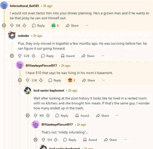 People murmured about how he’s too picky, how it’s ‘missing something’ every time. And come on—Hamburger Helper as the ideal meal? That detail kept surfacing again and again. The collective frustration was almost tangible. It wasn’t just about the food, but the feeling of cooking your heart out only to have it pushed aside.