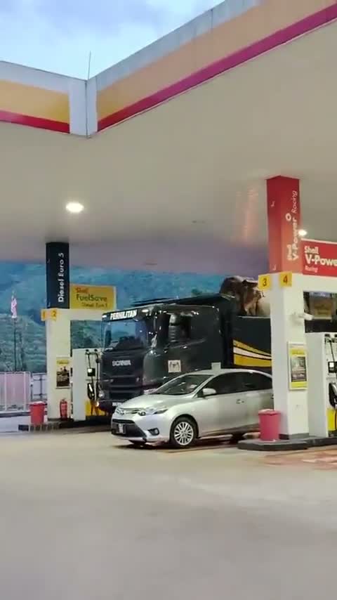 Simply pausing for fuel…while transporting a bunch of elephants.