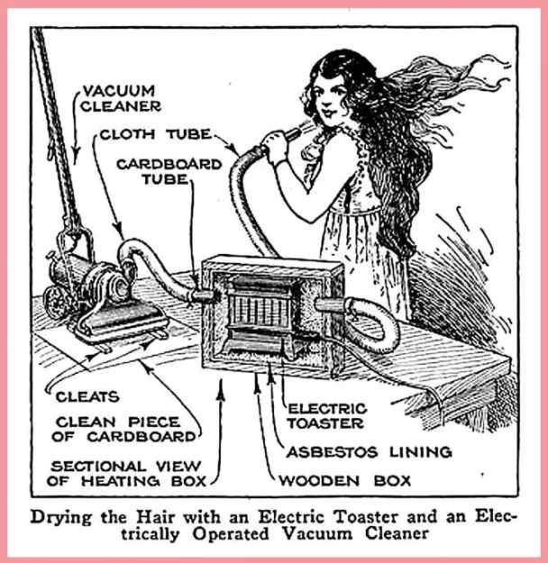 “Using an electric toaster and vacuum cleaner to dry hair: a bizarre life hack from the 1930s.”
