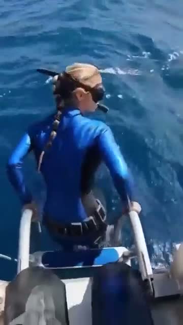 This female diver nearly descends straight into the gaping jaws of a massive shark.