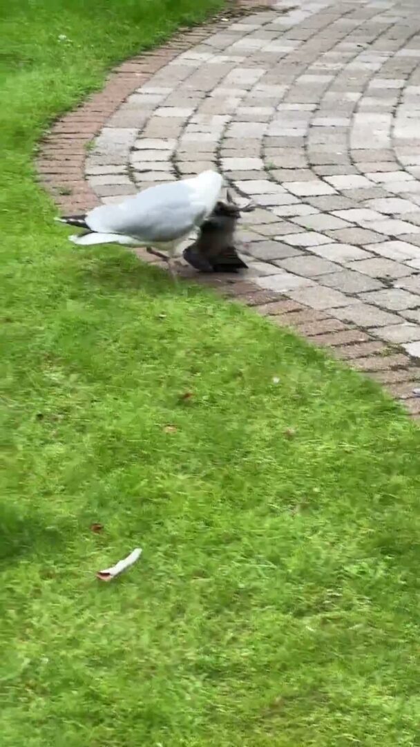 Seagull attempts to eat a pigeon.