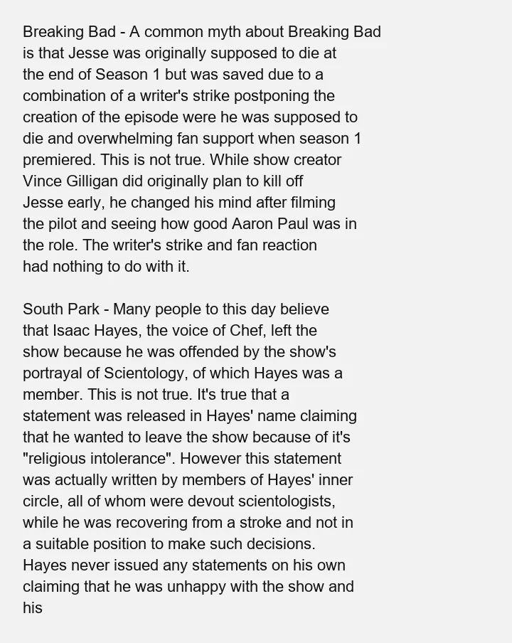 There’s this ongoing trend where one piece of “trivia” gets thrown around like confetti at a parade, and it’s hard to believe people still buy into it. Everyone’s seen the posts: “Did you know Jesse was supposed to die in Breaking Bad at the end of Season 1 but was saved thanks to the writer’s strike?” Or the classic take on Isaac Hayes leaving South Park because of its supposed jab at Scientology. But, surprise! It’s all just a big pile of not-true.