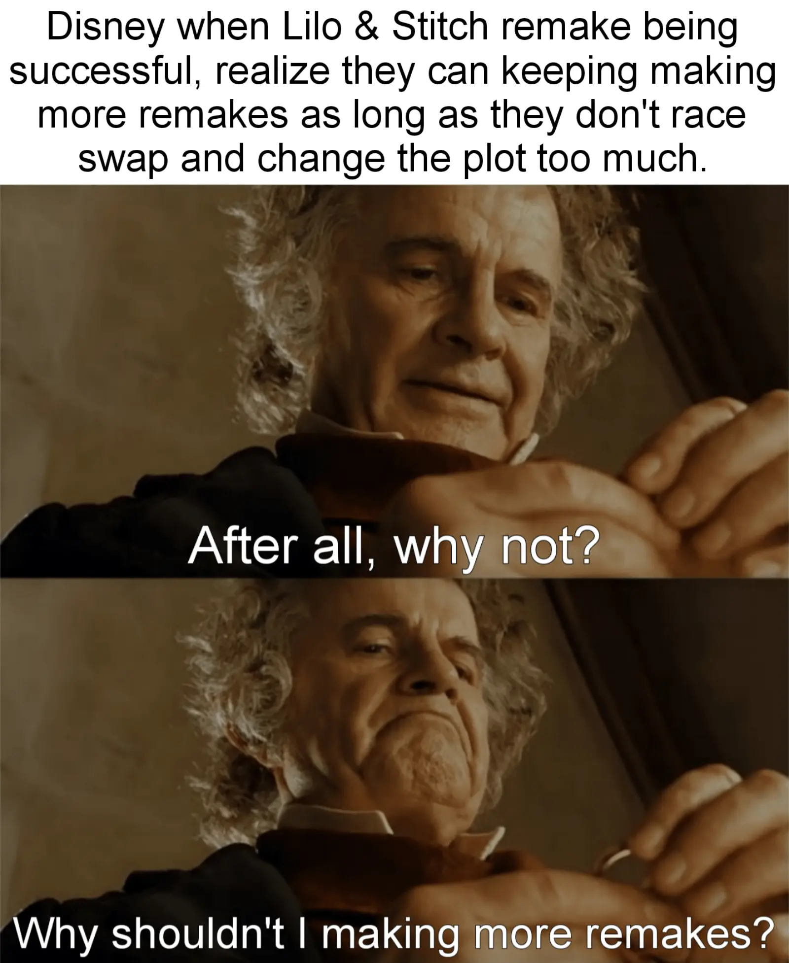 “Why Disney? Why not do the same with this movie as you’ve done with all your other remakes?” is a meme that surfaced in response to the trend of Disney creating live-action adaptations of its classic animated films. The phrase is used to express skepticism or criticism regarding Disney’s decision-making in choosing which stories to adapt, often highlighting a perceived inconsistency or lack of originality. It reflects a broader conversation about the balance between nostalgia and innovation in the entertainment industry.