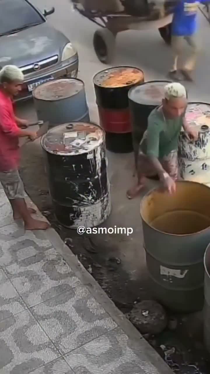 Video is too low resolution to tell….the symbol is much more circular than the vast majority of flammable black and white labels you’ll find in a Google search. That said this also looks like a poorer country/area (based on the lack of shoes, the car, the cart in the background, etc)…most of the barrels are different than the others and are not labeled as far as we can see. So it’s very possible our expectations of what we think we’re seeing happen here is much more “advanced” than what the people in the video are experiencing. Might be a label like suggested, might be some other sticker of some kind, might be a repurposed barrel, might be straight from the factory. Point being that we can sit here and speculate on what we think we’re seeing, but the video is simply too poor in quality to know anything more than whatever was in the barrel was definitely explosive/volatile.
