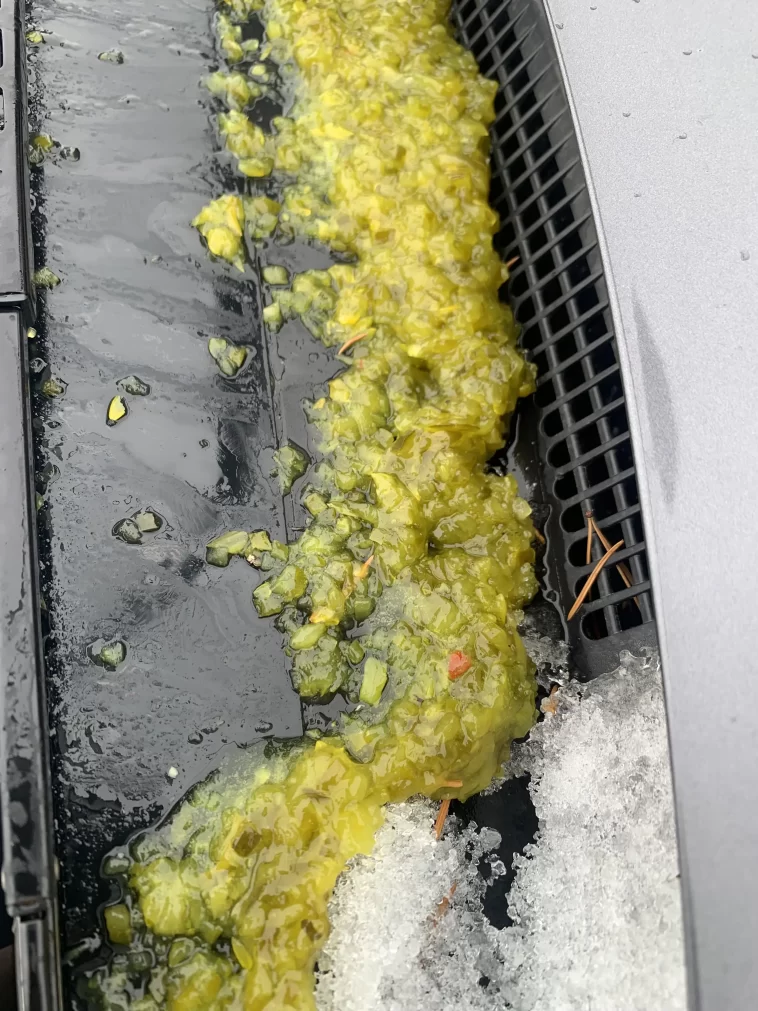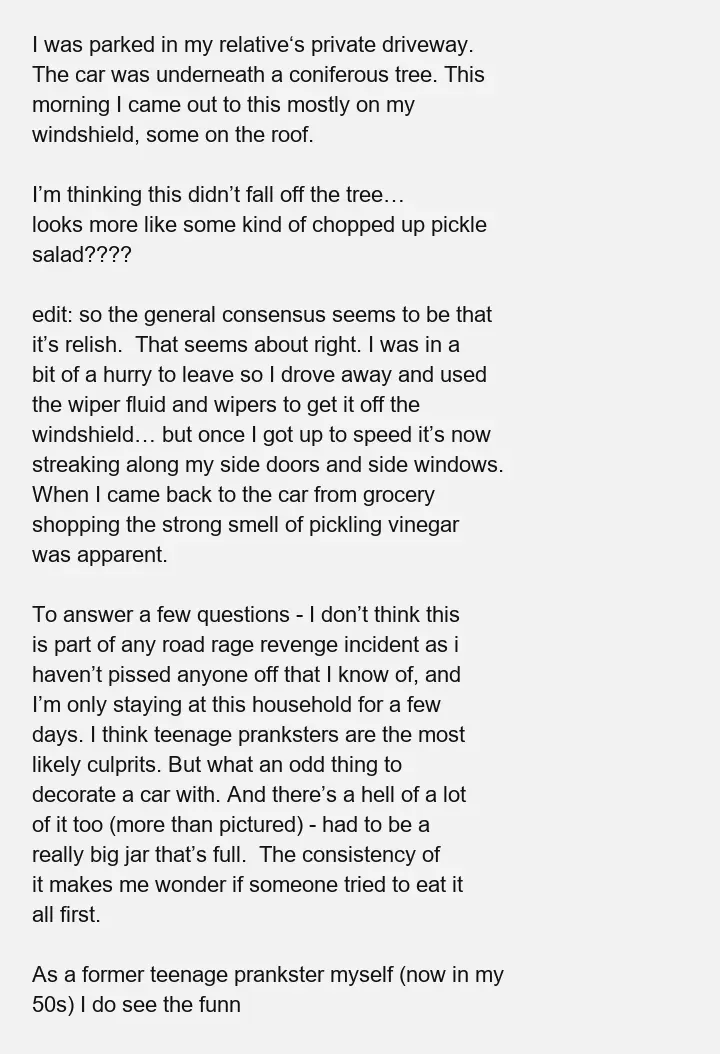 g the collective curiosity of many who’ve stumbled upon it. The scene depicts a car parked under a conifer, only to emerge from the relative’s private driveway to find what looks like a bizarre pickle salad splattered across the windshield. The vivid image and the unexpected, somewhat humorous nature of it have drawn attention, leaving people puzzling over the backstory.