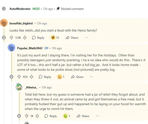 As the discussion unfolded, the vibe turned from confusion to a sort of camaraderie amongst those who found themselves enchanted by the absurdity of it all. People weighed in on their own experiences with teenage pranks and the sometimes strange, chaotic nature of being young. The sheer quantity of the condiment seemed to fascinate everyone, as if pondering the motivation behind such a peculiar choice of decoration for a car. The idea that it might have taken a whole jar of relish to create the mess sparked hilarity, with commenters joking about what kind of party would lead to such a situation.
