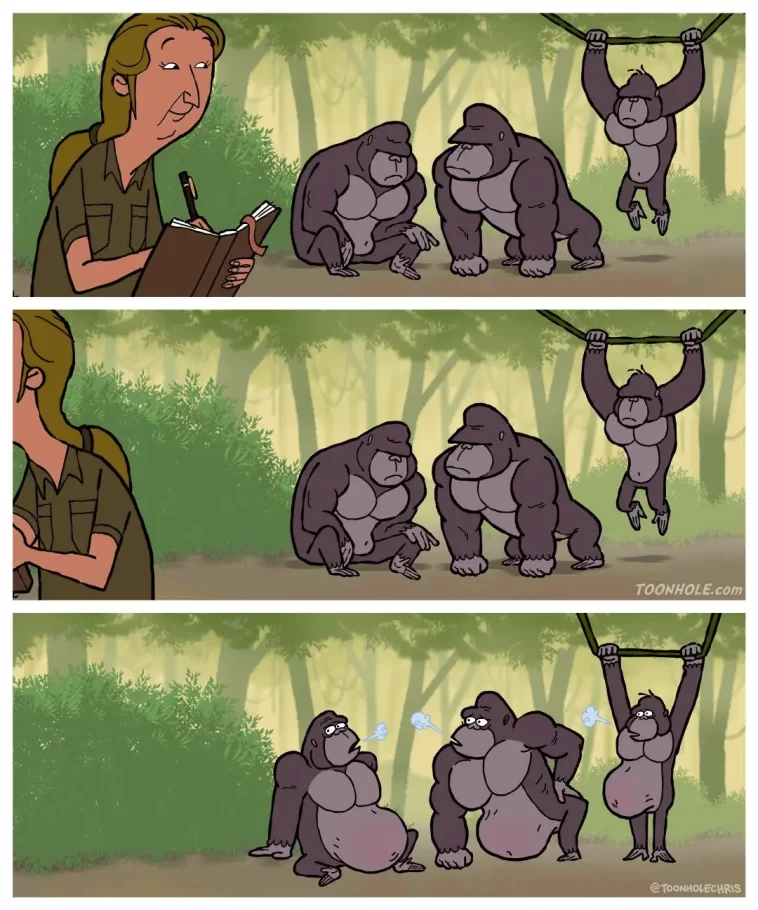 This messed me up so hard I thought ~~the guy~~ Jane Goodall impregnated the three of them just by looking at them I was so confused