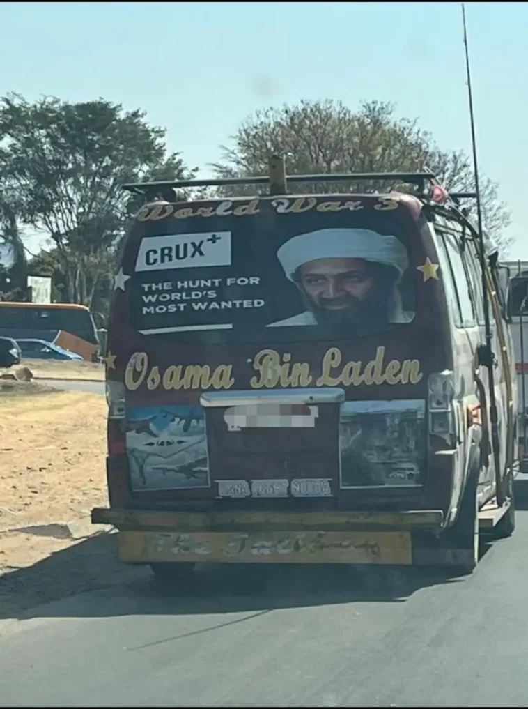 I didn’t say that I didn’t know who Osama bin Laden is (or was, as it stands). My point was just that this mural plastered on a vehicle seems pointless. What’s the takeaway from this?