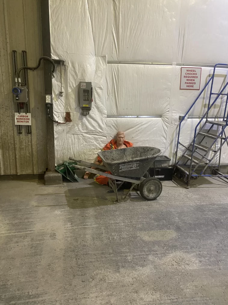 He’s just sitting there staring at the wheel barrel like it’s a foreign device, Resusci Andy isn’t very handy.
