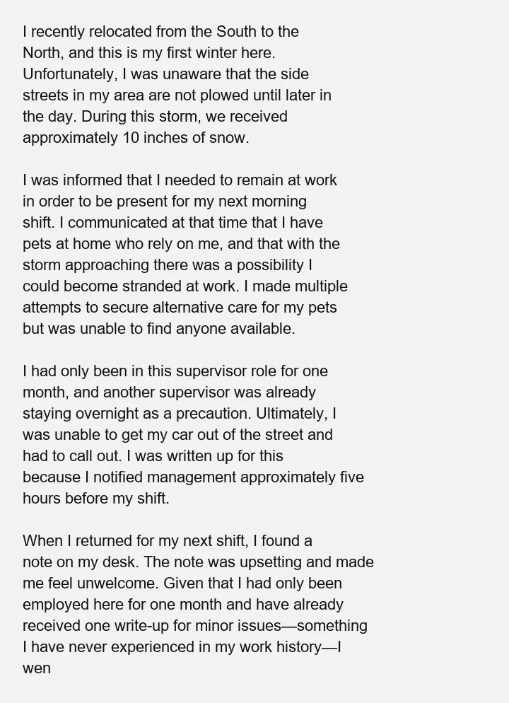 The whole thing kicked off when the original poster shared their experience on Reddit, venting about the challenges of adapting to a job in a new state. After they couldn’t safely get home due to the snow, they did what many would: they reached out to that towering corporate entity but still got slapped with a write-up. It hits different when someone is trying to do their best but ends up feeling the sharpness of their workplace for minor, totally understandable choices. And then, to find a negative note waiting on their desk? Oof. That’s a gut punch right there.