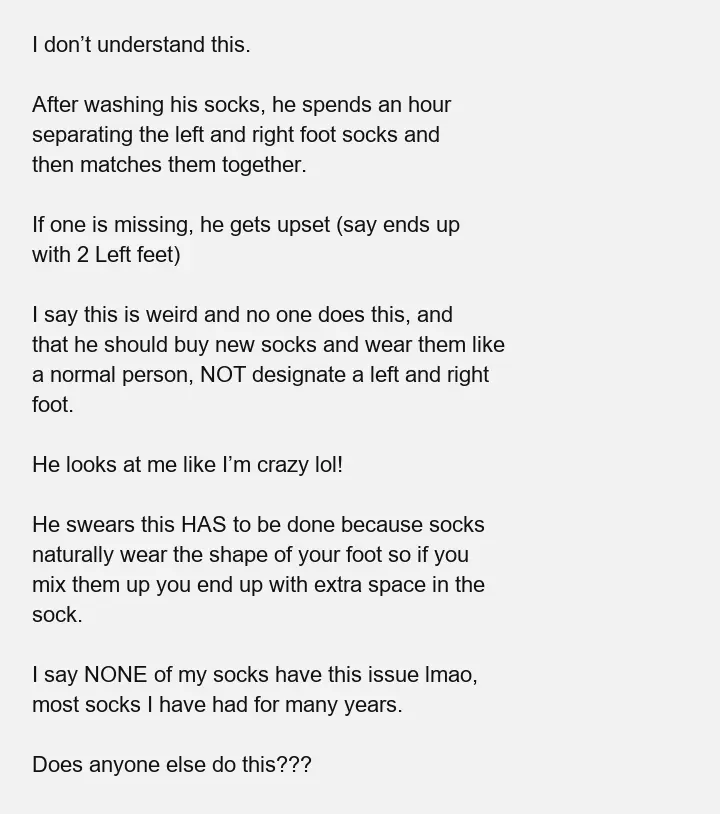 The ongoing saga of the husband who designates a left and right sock has captivated the internet with its mix of bewilderment and bemusement. After all, who has the patience to spend an hour meticulously separating their socks? Yet, that’s precisely what this husband does after every laundry session. This isn’t just a quirky habit; it’s transformed into a ritual that triggers some real passion.