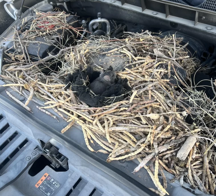 Looks like the nest is mostly mesquite beans. Usually they are 1/2 dried dog turds and cactus. Hopefully you got him on time. Wiring harness repairs suck.