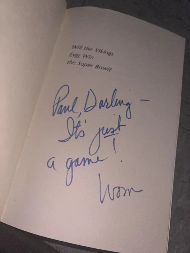 **What Happened:** I recently decided to spice up my bookshelf and ordered a copy of “Will the Vikings Ever Win a Super Bowl” from a used book site. When it arrived, I flipped it open, only to find the first page bearing a handwritten message: “Good luck with this one!” I couldn’t help but chuckle; the previous owner must have been a fan who had lost all hope and decided to pass that burden along to me.