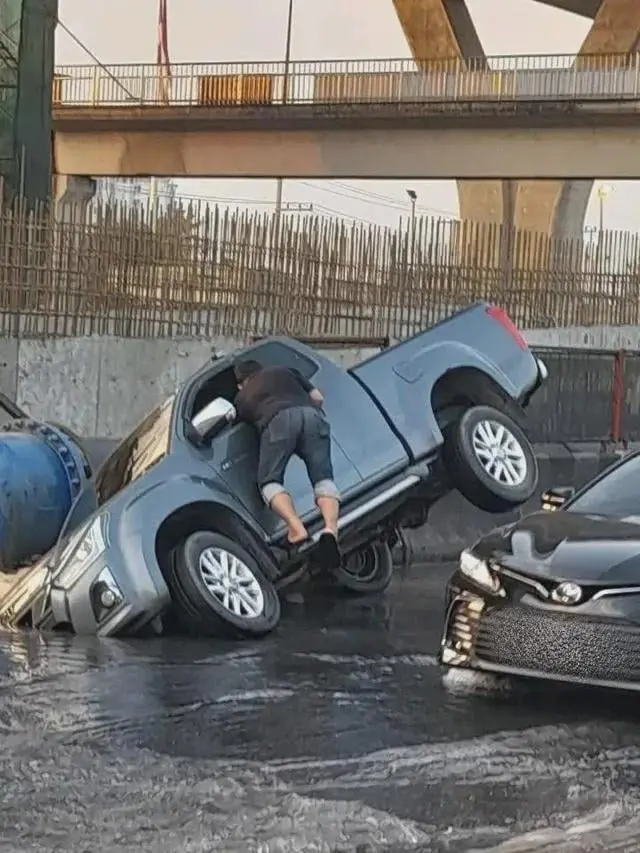 In Bangkok, Thailand today, a pickup truck plunged into a massive hole caused by a ruptured 1,000-mm water pipeline, leading to significant traffic disruptions.