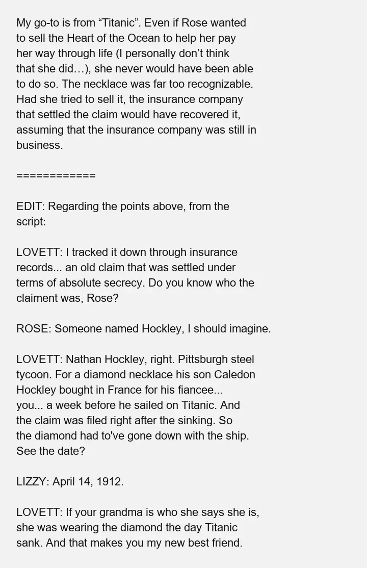 necklace would’ve been nearly impossible. It turned out that the whole situation surrounding the necklace was locked tight in insurance records, leaving a trail that would’ve easily led back to her. The details about how the diamond was linked to a claim filed by her fiancé’s family right after the Titanic sank? Heart-wrenching for sure, but also illuminating. It’s easy to forget how a story like that could have real-world implications, with insurances and certifications adding layers to the narrative.