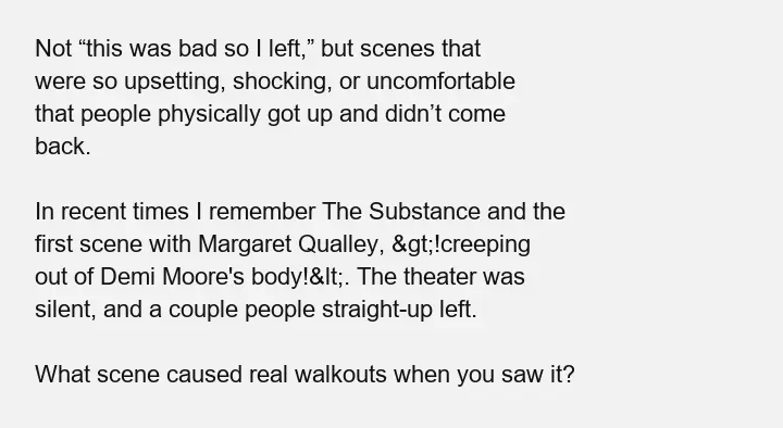 e line. There seems to be a sort of camaraderie among those who’ve experienced the chaos of a sudden walkout, sparking discussions that veer into territory like, “Can filmmakers really go too far?” or “What makes a scene worthy of leaving the theater?” Those lingering feelings of discomfort and disbelief create a fascinating thread in the fabric of movie-watching culture. It makes one think about the limits that audiences set for themselves and how the intent behind those shocking scenes plays with viewer expectations.