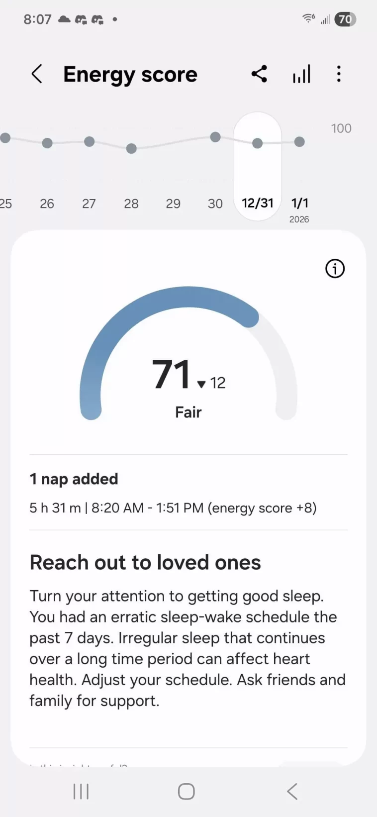 “Reach out to loved ones” is exactly what the damn thing says. And then more follows below. It’s the largest damn font on that screen aside from “energy score” Are you OK? Are you having a medical episode?