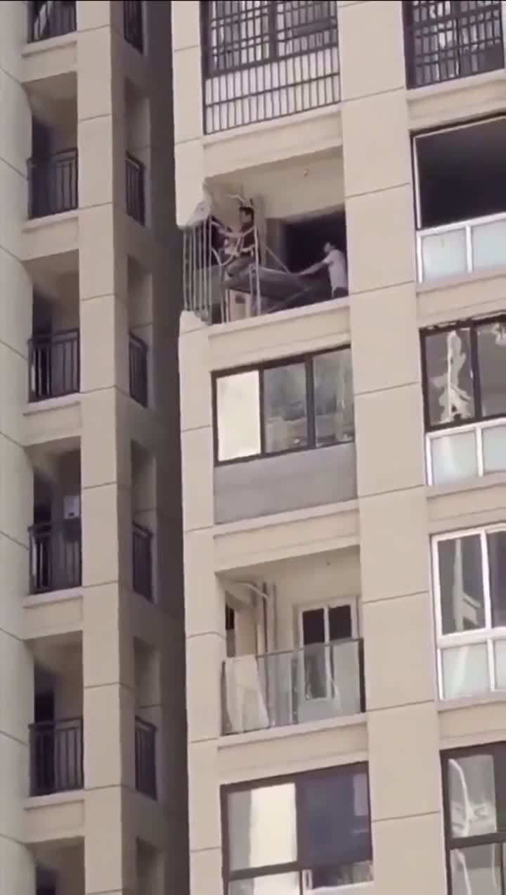 This is in China. I’m sure the building owners would quickly install load-bearing styrofoam sheets. I’m kidding…sort of. Apparently the Chinese man found it easy to cut out the corner since they were originally weak reinforcing panels.