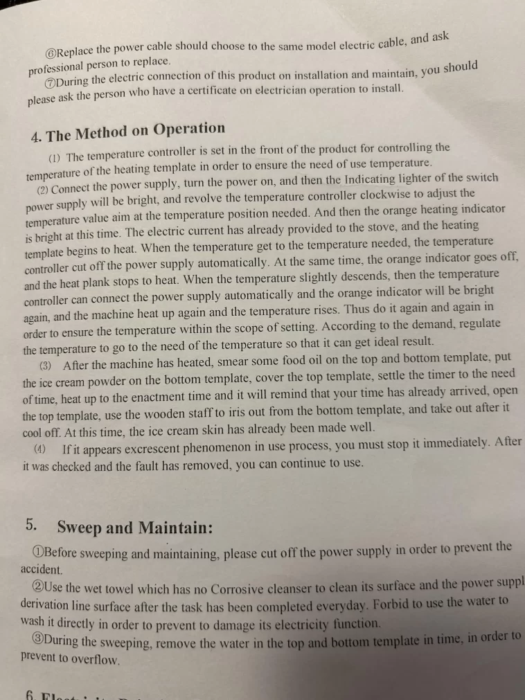 “(3) After the machine has heated, smear some food oil on the top and bottom template, put the ice cream powder on the bottom template, cover the top template, settle the timer to the need of time, heat up to the enactment time and it will remind that your time has already arrived…”
