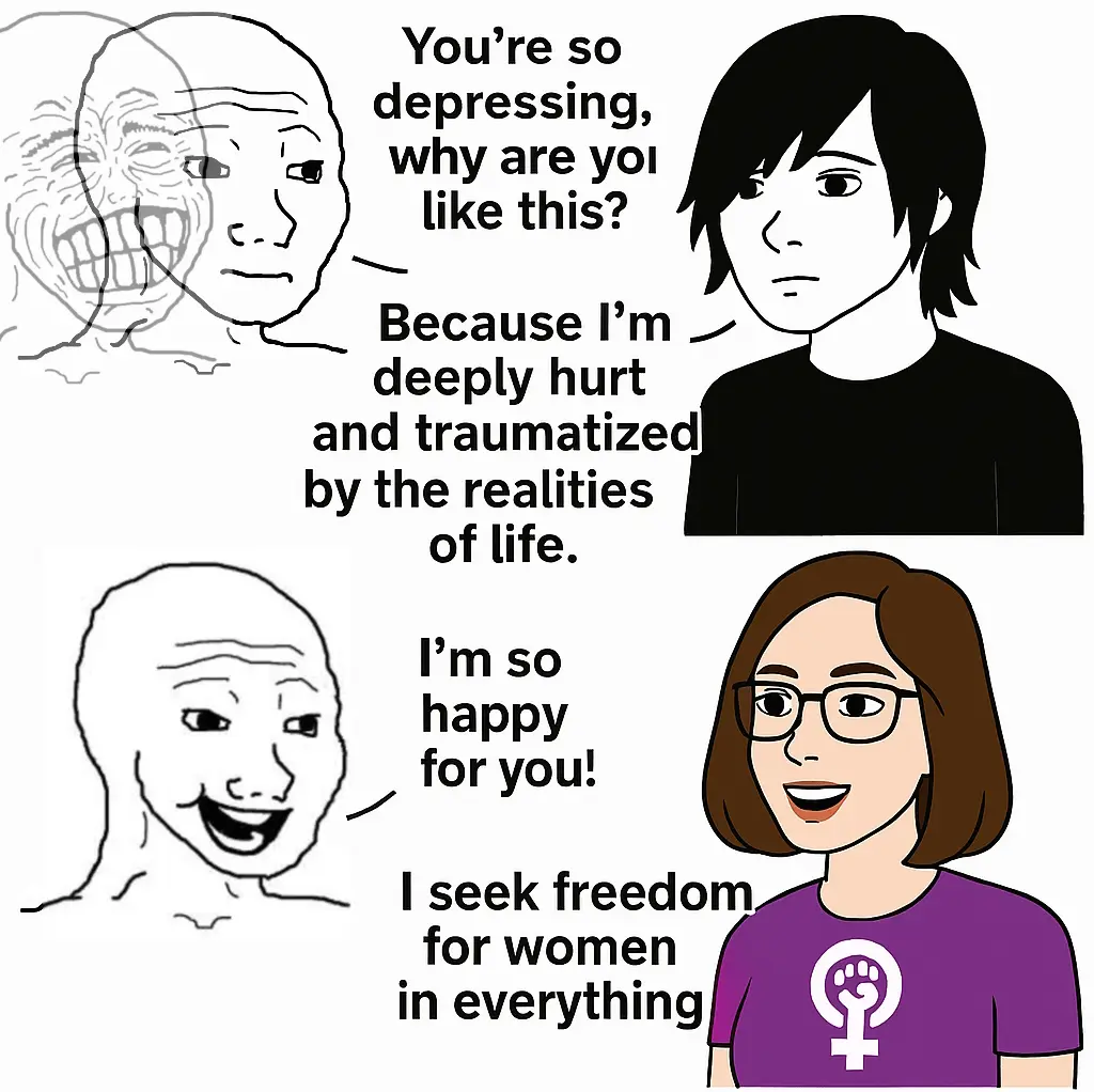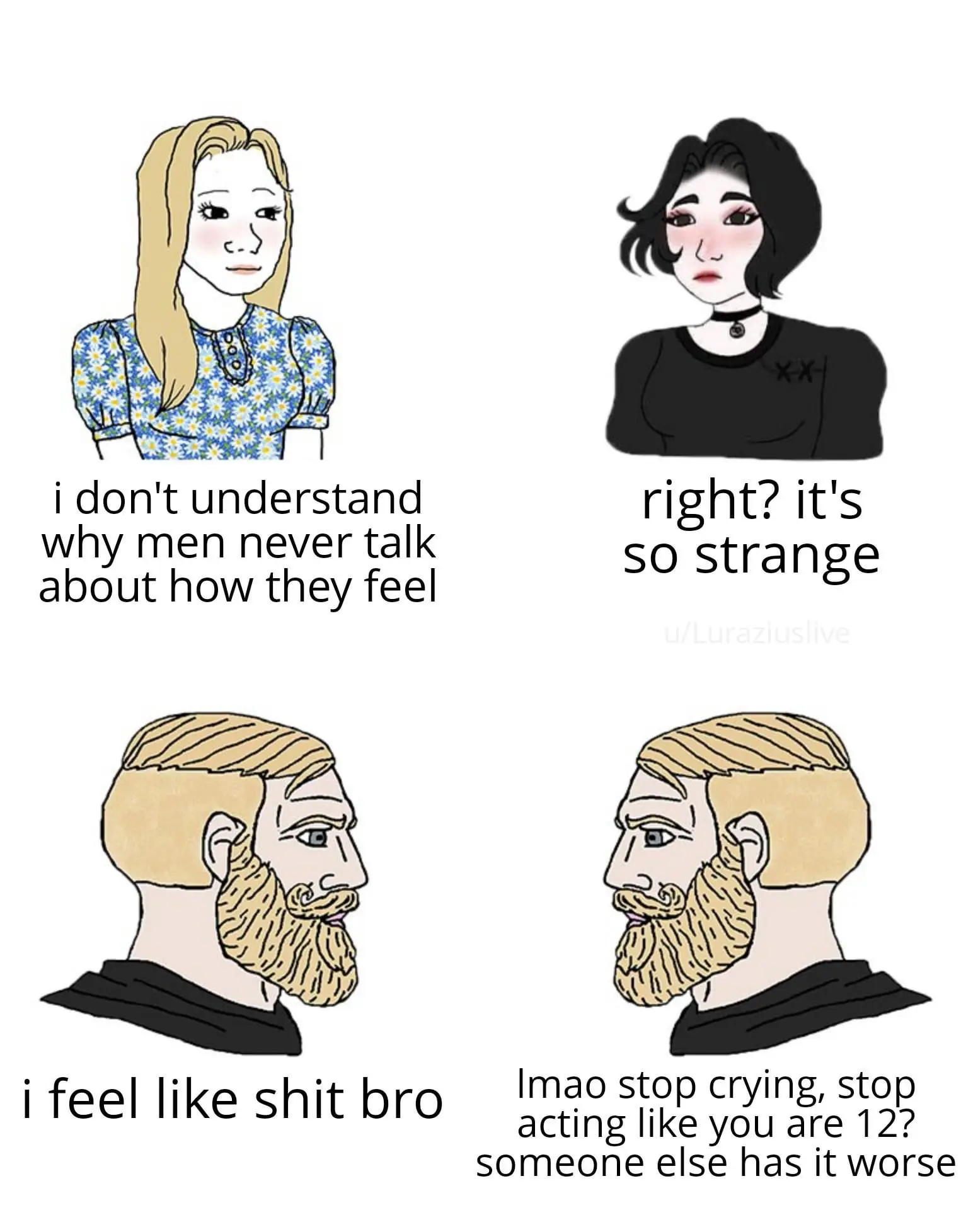 “Why are men like this? HAHAHAHA” is a meme that humorously critiques male behavior through the lens of relatable and often absurd scenarios. The phrase is typically paired with images and text that illustrate stereotypical or exaggerated male actions, making light of the idiosyncrasies of modern masculinity. The meme often evokes discussions about gender stereotypes and societal expectations while maintaining a comedic tone.