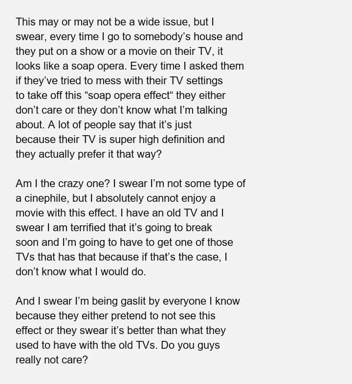 g experience that has a bunch of movie lovers clutching their hearts in despair. As they scroll through threads, it’s hard not to sense the slight judgment lurking beneath the surface, an undercurrent of disbelief that anyone could genuinely enjoy this bewildering advancement. The vibe is thick with worry and disillusionment, the realization that some might never see their shows in the same beautiful, cinematic light again. And just like that, a simple conversation around TV settings spiraled into one of the more bizarre topics of online discussions, leaving everyone wondering when did the world decide it was okay to trade immersive storytelling for slogging through a glossy, soap opera nightmare?