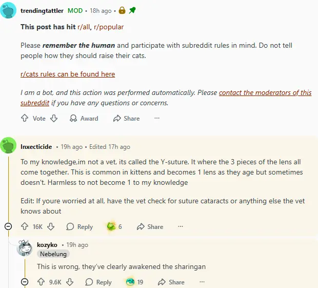 As the conversation unfolded, the vibe shifted from mere curiosity to a collective sense of awe. Comments flew in from all directions, with people discussing everything from their own cats’ eye reflections to other strange phenomena they’d encountered. There was a palpable excitement in the air, as if everyone was witnessing something special together. Some pointed out how cats’ eyes can reflect light in unexpected ways, while others couldn’t help but express their bafflement over this specific shape. It quickly became one of those topics that people couldn’t stop bringing up, with many feeling like they were missing out if they didn’t share their own thoughts.