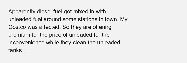 Sometimes you get lucky at the pump. Who would’ve thought a simple visit to fill up would turn into a small stroke of fortune? Diesel fuel somehow got mixed in with unleaded at various stations around town, and now those who’ve had their gas tanks filled at specific locations are finding themselves in a surprisingly sweet spot. At least, for the moment, it’s premium prices for unleaded, courtesy of Costco’s effort to sort out the mess. It’s like a random act of kindness from the gas gods, or just a strange twist of fate—people are definitely factoring it into their daily grind.