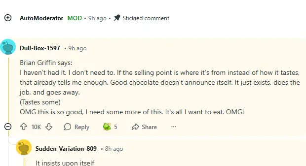 Comments ranged from amusing anecdotes to incredulous rants about the chocolate’s reputation versus the reality. The sheer number of reactions seemed to elevate the bafflement; it was as if everyone was trying to outdo each other with tales of chocolate disappointments or peculiarities. It turned into this communal vibe of disbelief mixed with laughter. Someone would mention a bizarre filling, and suddenly, it was like a floodgate opened—everyone had to chime in about how their taste buds were left hanging.